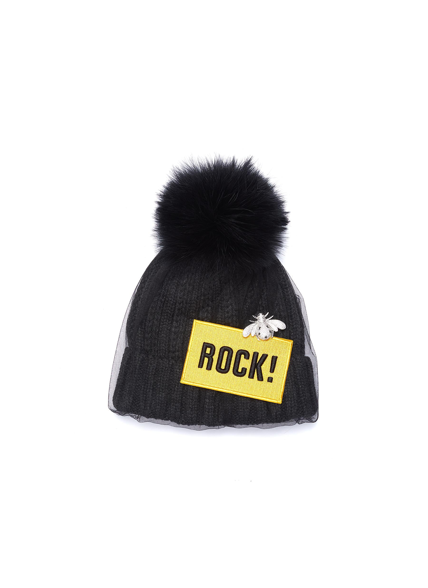 'Rock!' slogan appliqué embellished veil wool beanie - Venna - Black